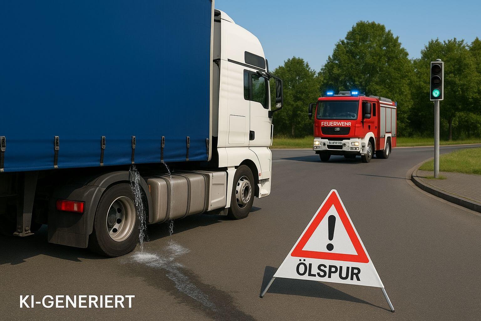 Auf der Straße war keine Ölspur, sondern lediglich eine Wasserspur. Vermutlich war im Kurvenbereich Wasser von einer LKW-Plane auf die Straße gelaufen...