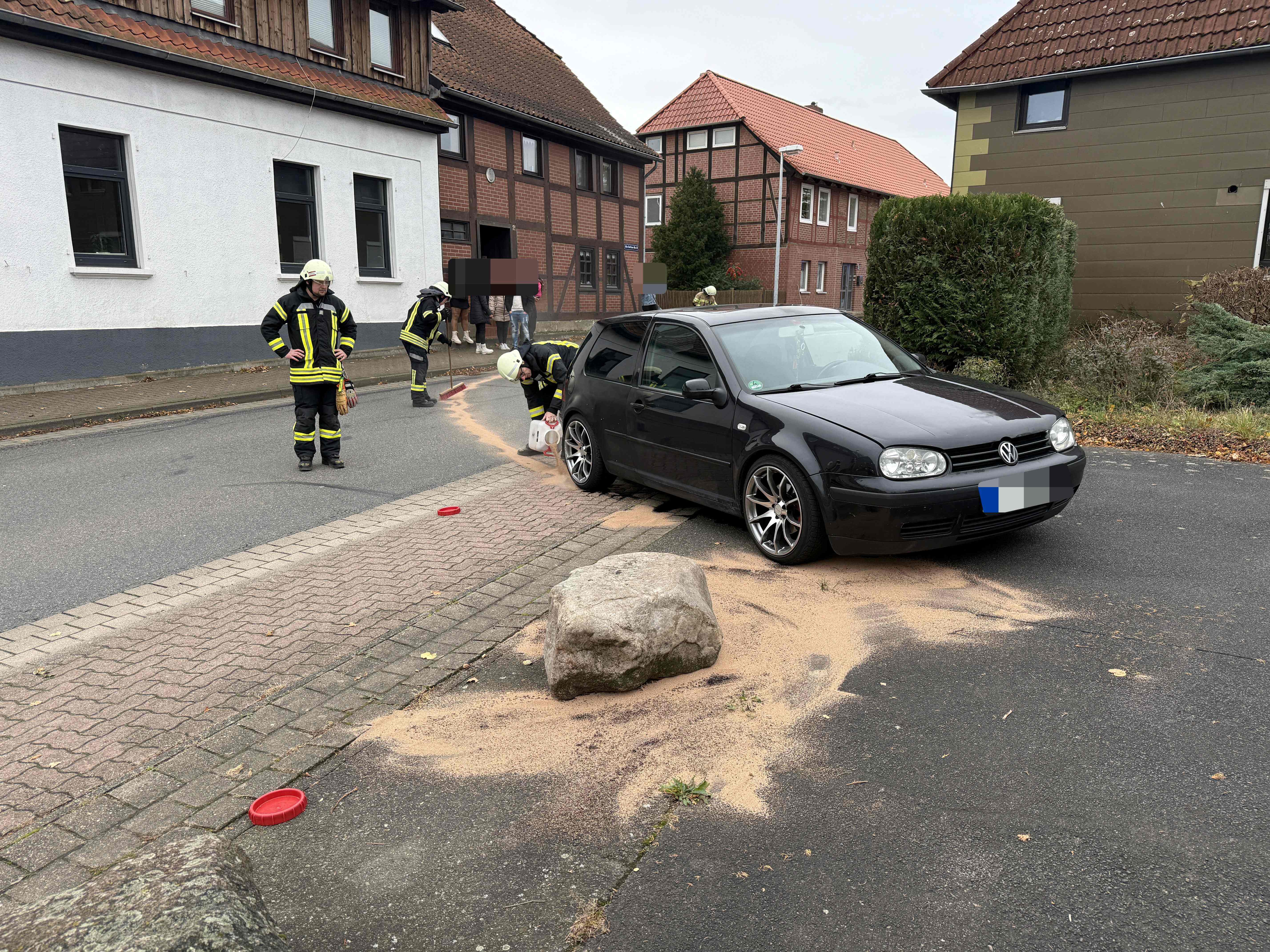 Beim Eintreffen an der Einsatzstelle stellte sich heraus, dass bei einem PKW der Motor während der Fahrt geplatzt war, und dadurch Motoröl ausgelaufen war. Der Fahrer des PKW lenkte sein Fahrzeug noch von der Straße in eine Grundstückseinfahrt, wo der Wagen dann liegen blieb.