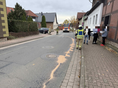 Beim Eintreffen an der Einsatzstelle stellte sich heraus, dass bei einem PKW der Motor während der Fahrt geplatzt war, und dadurch Motoröl ausgelaufen war. Der Fahrer des PKW lenkte sein Fahrzeug noch von der Straße in eine Grundstückseinfahrt, wo der Wagen dann liegen blieb.